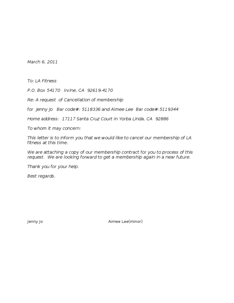 Cancellation Letter La Fitness Business