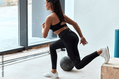 Side View On Strong Caucasian Female Leaning Leg Widely On Box